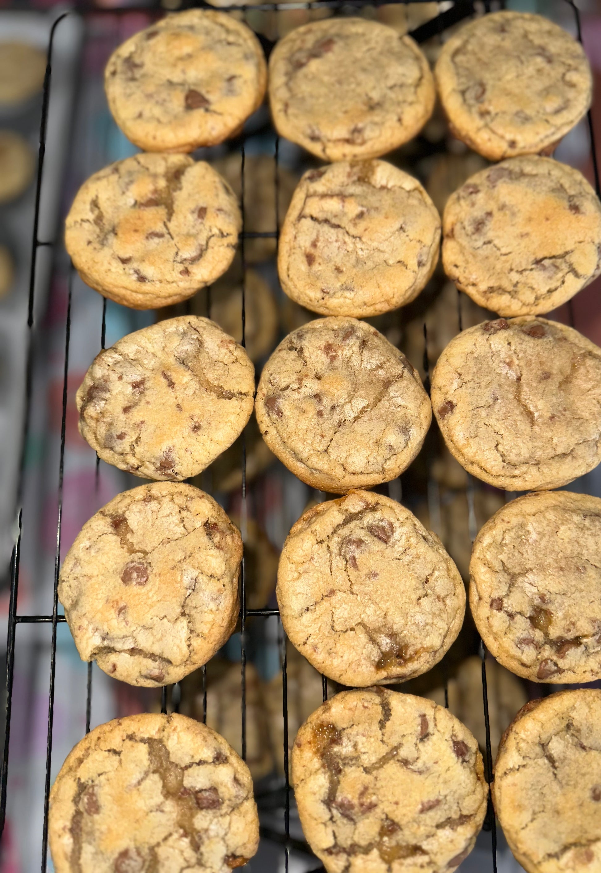 Soft and chewy chocolate chips cookies wit chopped up Twix throughout the cookie!
